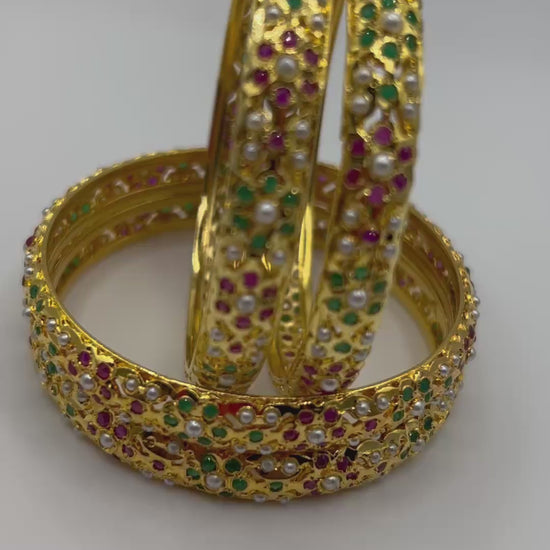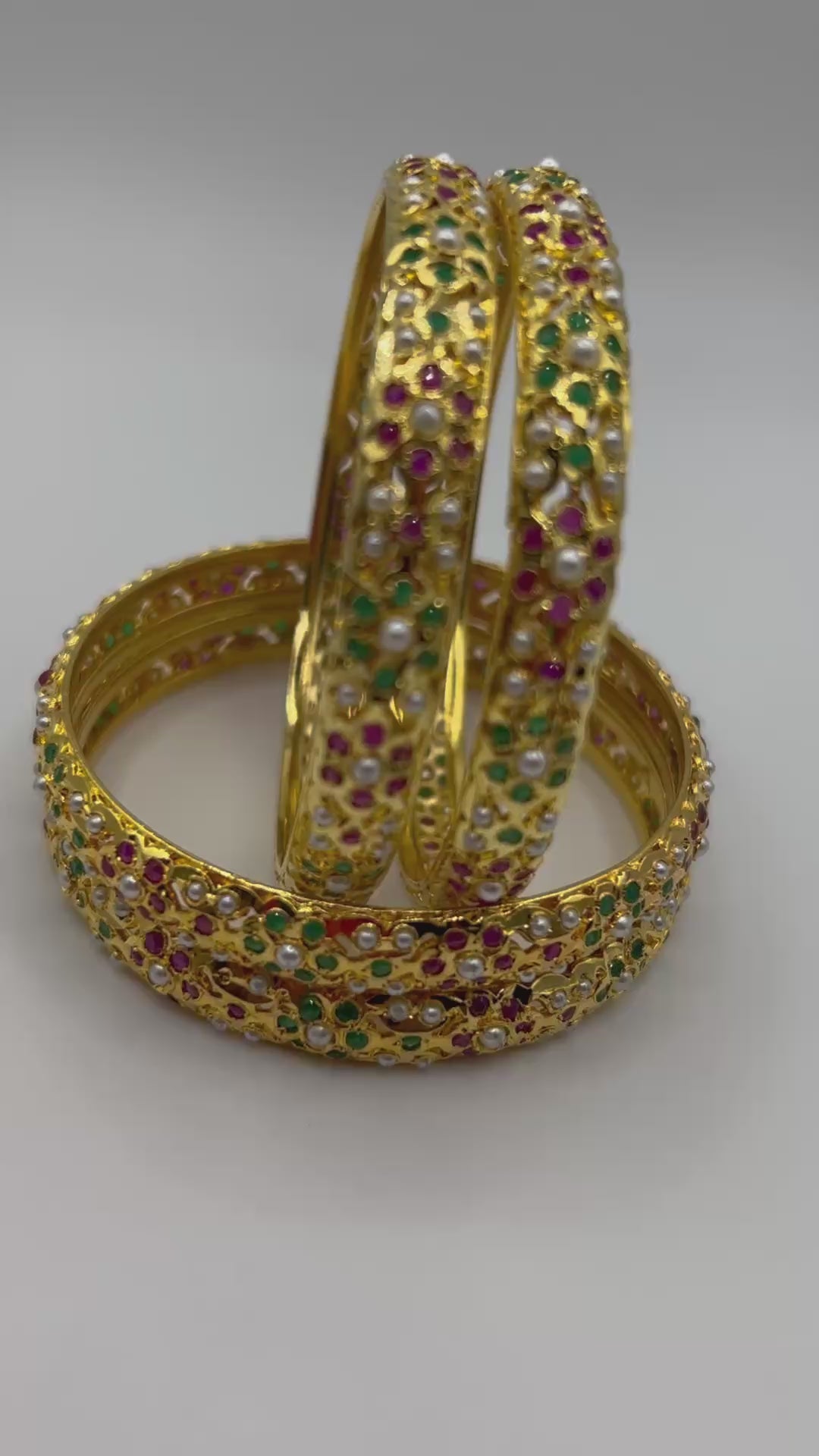 Elevate your traditional look with our exquisite Jadau Bangles. Made from 1 gm gold plated metal, these bangles come in sizes 2/4 and 2/6 to fit perfectly on your wrist. The intricate jadau work adds a touch of elegance and charm to any outfit. Upgrade your style with our statement bangles.